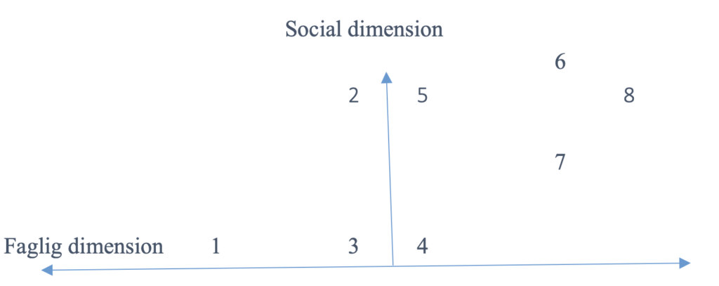 - Analysen viste således store forskelle ikke kun mellem de otte arbejdspladser, men også mellem forskellige situationer på den samme arbejdsplads. Samtidig blev det tydeligt, at deltagelse i disse situationer ikke fremstår som lige vanskelig for praktikanterne. De mere ritualiserede og gentagne former for kommunikation, som fx forekommer i supermarkedets kundebetjening, beherskes hurtigere end de løsere former præget af forhandlinger og overlap mellem faglige og sociale formål. Analysen tog udgangspunkt i en gængs opfattelse af, at man på arbejdsmarkedet kan skelne mellem fagligt relevante situationer på den ene side og socialt relevante situationer på den anden side, men denne opfattelse blev der stillet et stort spørgsmålstegn ved. I stedet viste det sig, at der var grader af faglig udfordring i de forskellige situationer, men at ingen situationer fremstod som uden social betydning. Praktikanterne havde med andre ord i alle sammenhænge potentielt deres sociale identitet på spil. Derfor opstillede vi følgende figur og indplacerede typiske situationer fra de otte arbejdspladser i forhold til de to dimensioner (numrene refererer til listen ovenfor):